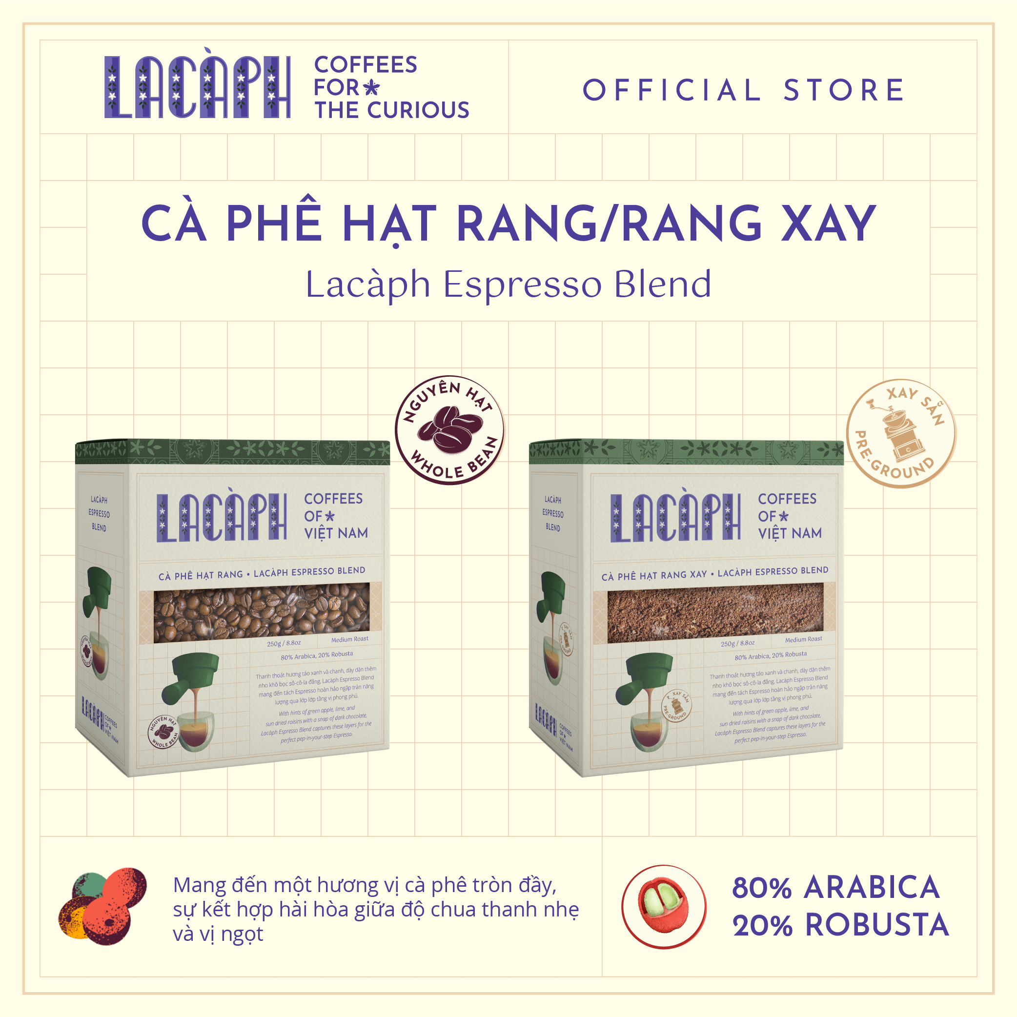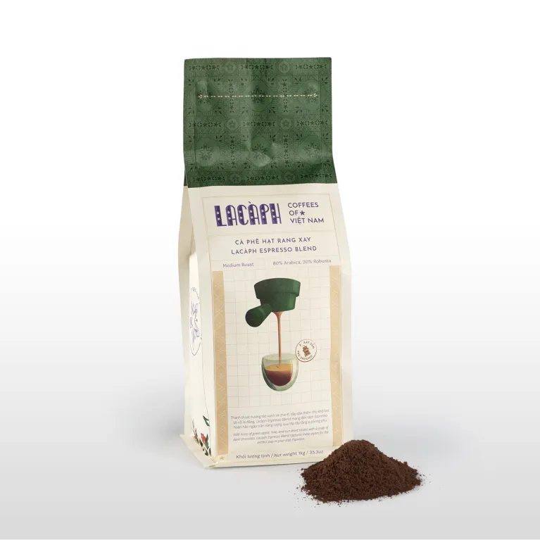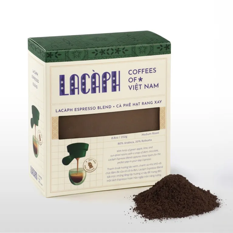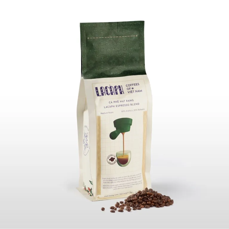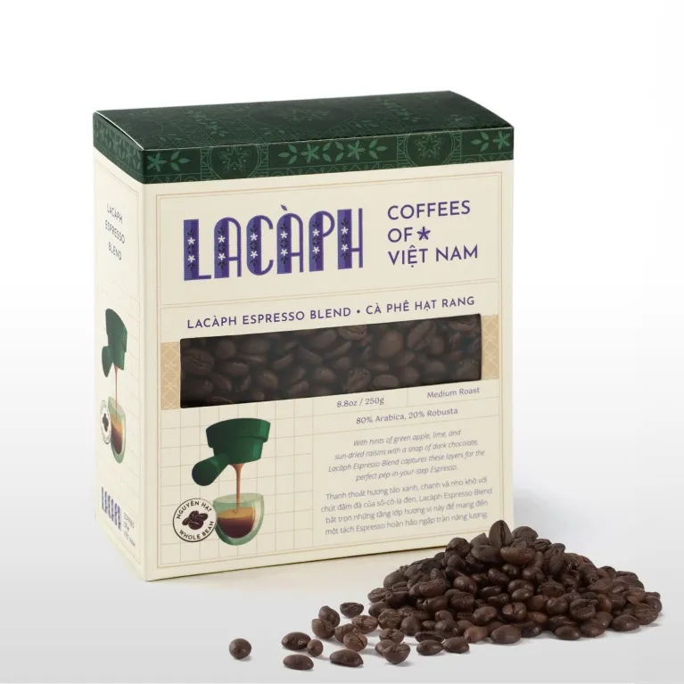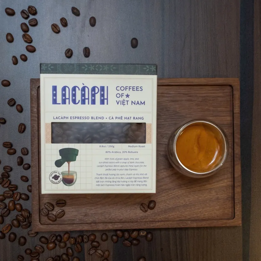 Lacàph Espresso Blend is a coffee blend made from Arabica and Robusta beans that preserves a variety of flavors. The coffee beans are grown in a pioneering Arabica farm in the Central Highlands of Vietnam. They are harvested and hand-picked before the honey process, dried, and packaged. Lacàph Espresso Blend is a smooth, full-bodied coffee that perfectly combines a mild acidity and a sweet finish.