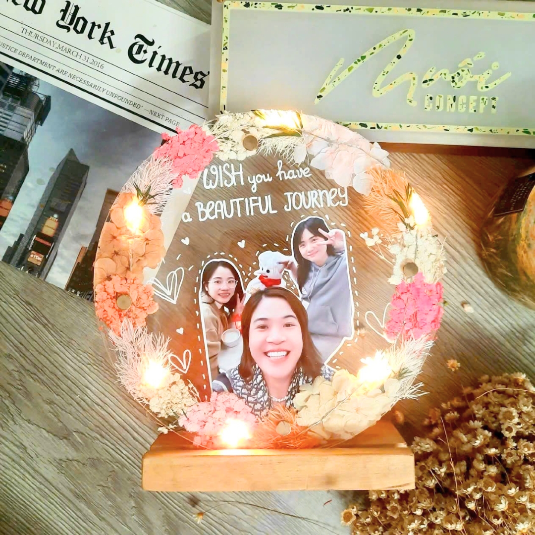 The frame is made from transparent acrylic plastic with beautiful dried flowers as the highlights. You can customize the frame with your favorite colors and messages and send it to that special someone.